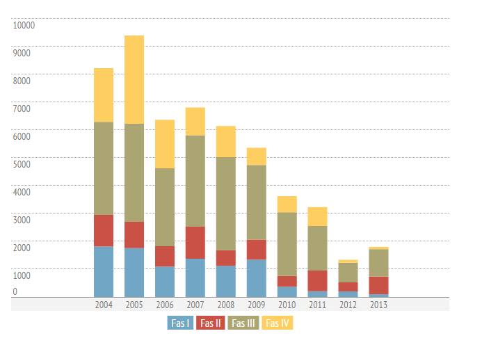 På bilden ser ni hur antalet startade kliniska läkemedelsprövningar, antal inkluderade patienter per prövningsfas minskar år för år