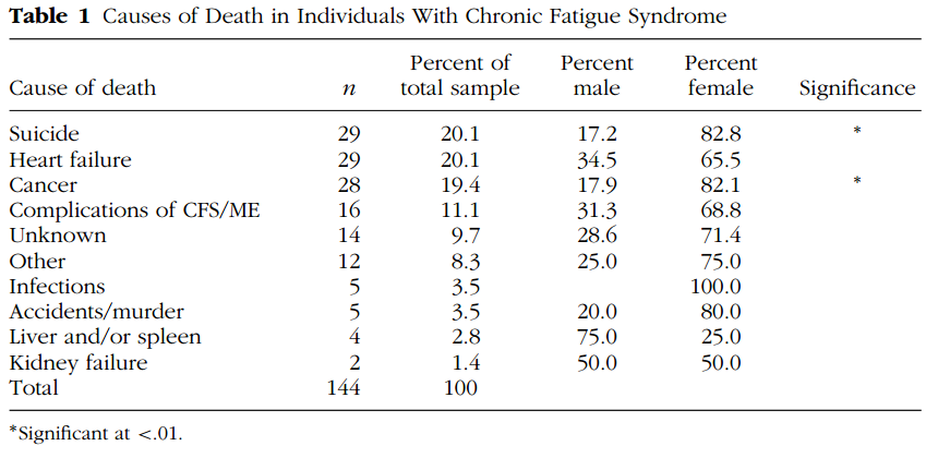 Leonars A Jason m.fl gick år 2006 igenom 144 st dödsfall bland CFS-patienter