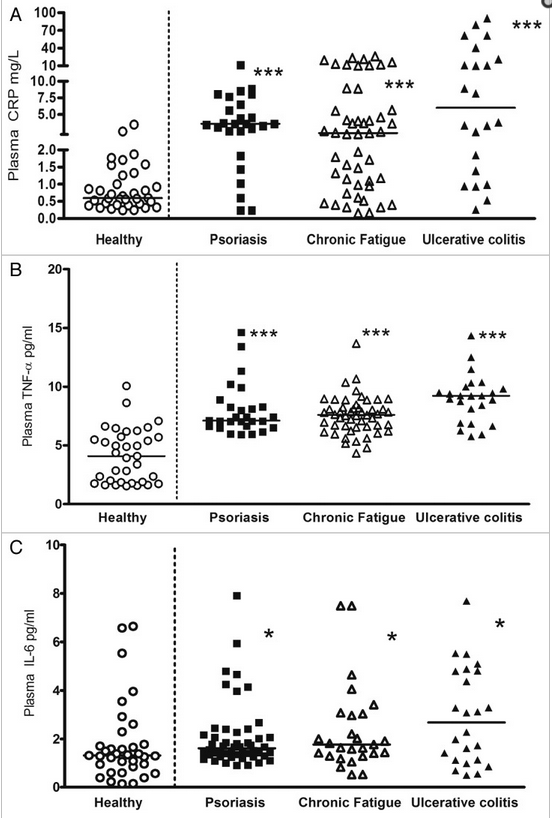 I början av studien hade alla patienter (med gastrointestinal UC, och icke-gastrointestinala CFS och psoriasis) signifikant förhöjda nivåer av tre blodbiomarkörer för inflammation jämfört med kontrollerna.