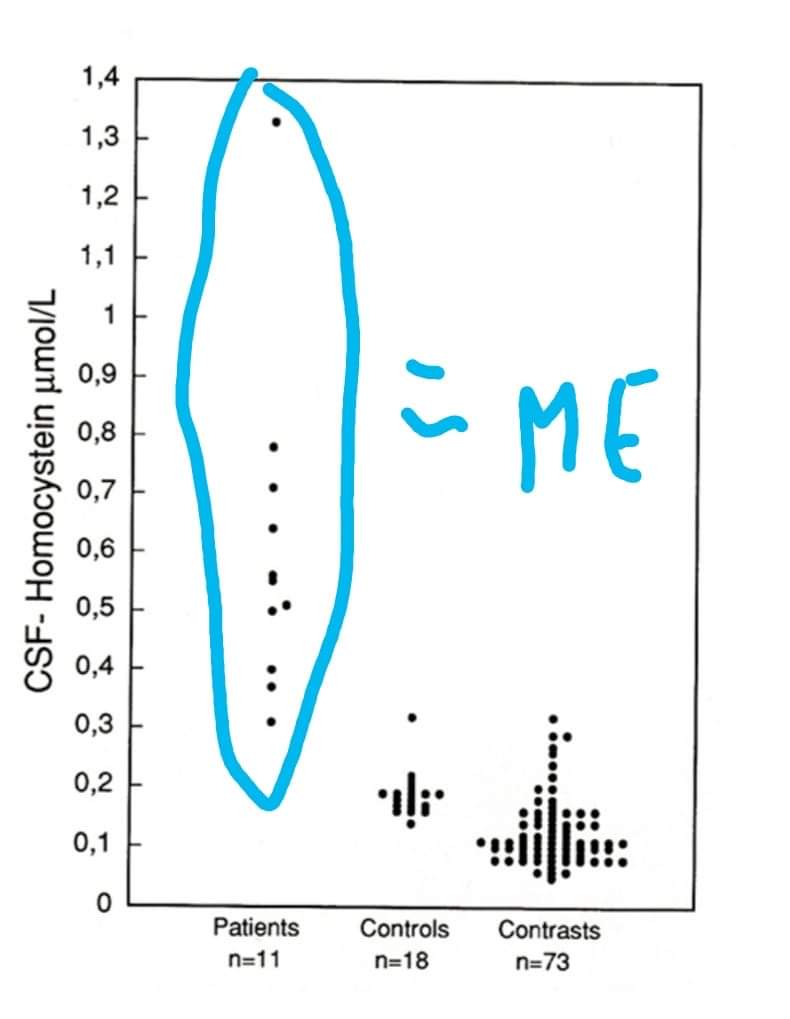 Det finns många exempel på ME-sjuka som har normala värden av B12, men ändå mår bättre av B12-injektioner. Homocystein kontrolleras oftast enbart i blod, och där kan man inte alltid se förhöjda nivåer. Däremot verkar det mer konsekvent vara förhöjda nivåer hos ME-patienter i likvor, och då behövs bl a B12, oaktat om man har normala nivåer av B12 eller ej.