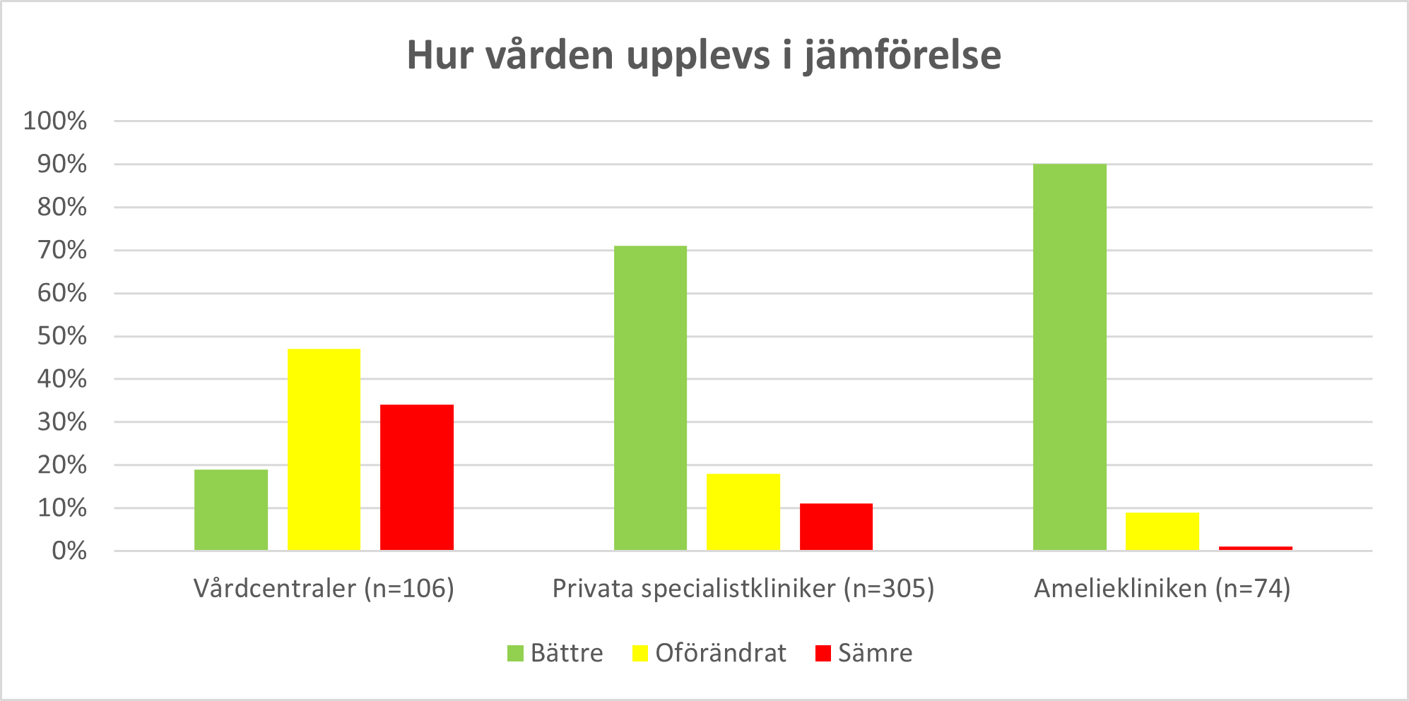 Anmärkningsvärt är att majoriteten är väldigt nöjda med specialiserade privatkliniker, och då i synnerhet Ameliekliniken. Den är dock i sammanhanget rätt liten och antalet som svarat är relativt få. Oaktat detta kan det vara rimligt att den expertis som finns på de privata specialistklinikerna faktiskt tillfrågas i både regionala och nationella sammanhang för att den kliniska erfarenheten de byggt på genom många år kan tillvaratas och spridas på bästa sätt. Inte då minst till vårdcentralerna.