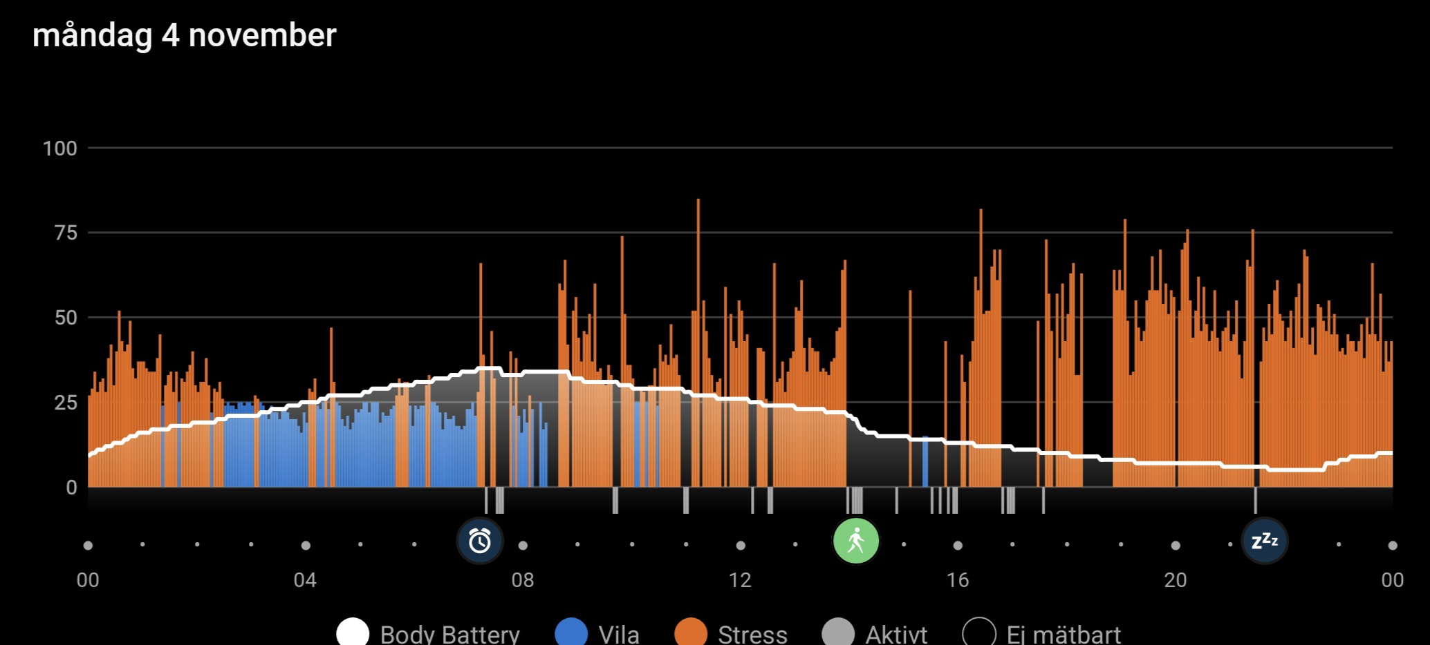 På torsdagen fortsatte jag, efter Thereses råd, med att införa korta pauser under dagen, och till min förvåning nådde mitt ‘body battery’ 55 poäng efter natten till idag fredag. Detta var ett rekord sedan jag började använda klockan för 11 dagar sedan. Pauserna bestod helt enkelt av att koppla ifrån alla digitala media och enbart koppla av i en fåtölj några korta stunder.
