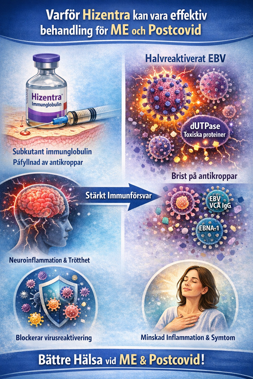 Hizentra verkar passa ME/Postcovid med låga IgG-nivåer och herpesvirusrelaterad immunbrist, där delvis reaktivering är central. Individuell dosering och klinisk erfarenhet bör prioriteras för att fler ska få tillgång, i linje med ny forskning om subkliniska virusprocesser.
