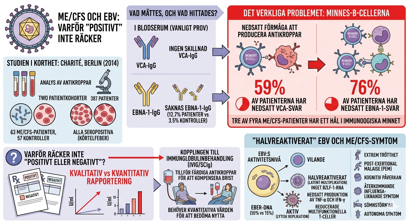 Studien från Charité ger tydliga belägg för att en stor andel ME/CFS-patienter har ett bristfälligt immunsvar mot EBV — ett svar som inte syns i vanliga blodprover men som avslöjas när man tittar på de faktiska antikroppsnivåerna i U/ml och framförallt på minnes-B-cellernas funktion.